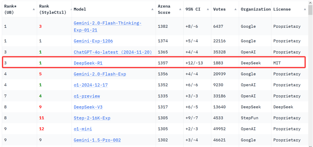 1月20日DeepSeek-R1发布,宣称“在数学、代码、自然语言推理等任务上,性能比肩 OpenAI o1 正式版”。时隔几日后,1月24日Arena榜单的发布(全称为:Chatbot Arena LLM Leaderboard),DeepSeek-R1榜上前三,其中在风格控制类模型(StyleCtrl)分类中与 OpenAI o1 并列第一。而其竞技场得分达到1357分,略超 OpenAI o1 的1352分。