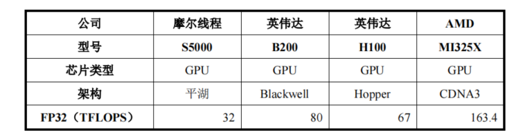 摩尔线程的数据中心卡旗舰产品为 S5000,单从 FP32 精度的算力的角度,摩尔线程 S5000 约为英伟达 H20(中国特供)的 70%,约为英伟达旗舰产品 B200 的 40%,因为缺少其他参数,无法做出综合比较。