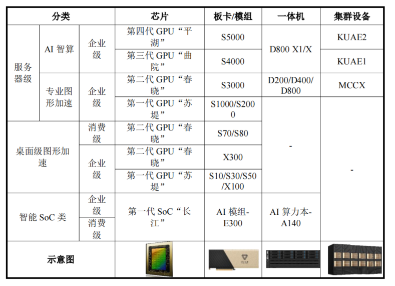 根据募集说明书,企业的产品主要是 GPU 产品,根据应用场景(纵轴)和集成程度(横轴)可以划分如下: